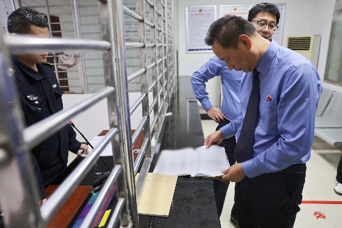 检查组首先围绕看守所民警依法履职情况、在押人员分类管理、重点人员风险管控等重点环节展开细致排查,全面梳理监区管理及执法流程中可能存在的安全隐患,确保不留死角、不留盲区。艾杰一边翻阅值班记录,一边强调:“越是节日期间,越要绷紧安全这根弦,每一个环节都不能掉以轻心。”