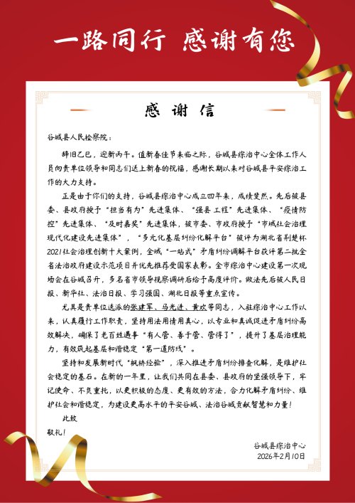 春节将至,年味愈浓,一封来自谷城县综治中心的感谢信,为谷城县检察院的冬日履职添上了一抹温暖底色。字里行间,是对过去一年并肩化解矛盾纠纷、携手守护平安的深深谢意,更是对检力融入基层治理的真诚点赞。